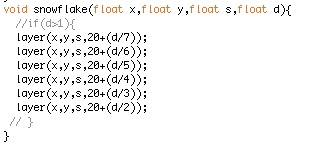 However with my code the way it was this proved difficult. I did learn some new things though in trying to do this. Such as using the brackets on voids to store variables, this came in handy when duplicating snowflakes as I could individually change each ones co-ordinates. I also learnt about the function pushMatrix and popMatrix which saves the previous co-ordinate positions (push) then reapplies them (pop). This was useful in combination with the rotate function as without it as I duplicated each snowflake it would apply the rotation around the previous snowflake, whilst with popMatrix it reapplied the previous co-ordinates so it spun in relation to its self.